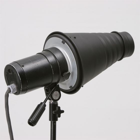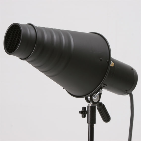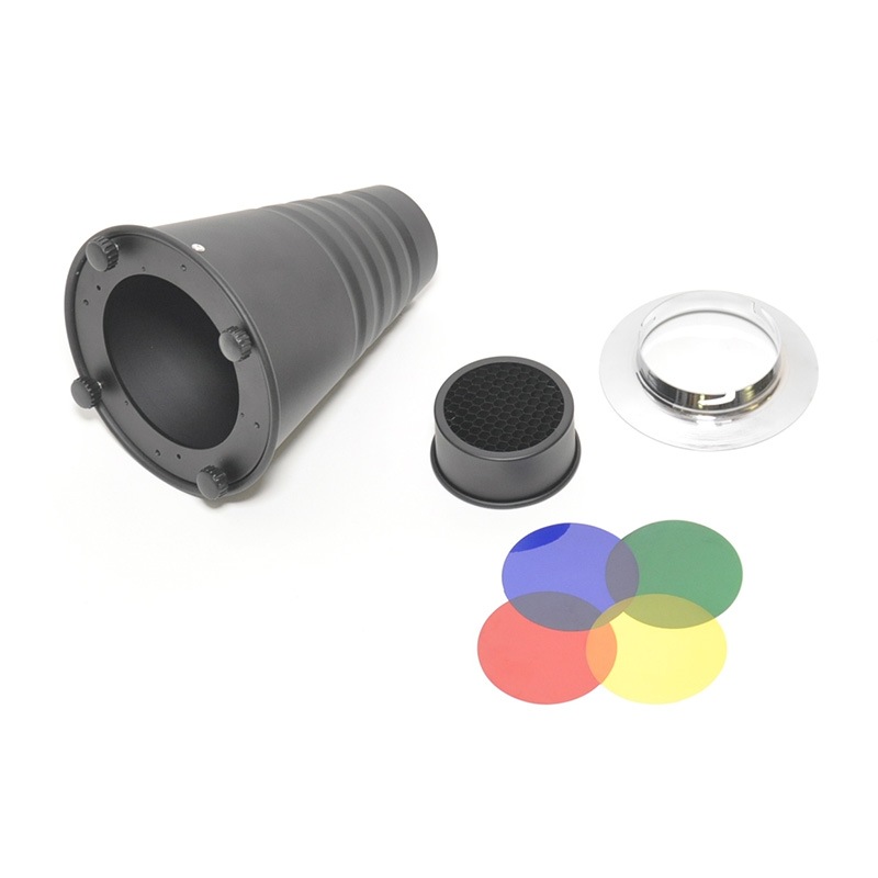 手軽にスポット効果が得られるコニカルスヌートは是非とも揃えておきたいアクセサリーです。しかし純正品は高価なものばかりで、黒ケンを巻いて代用していましたが、この汎用型なら気軽に使用できます(購入時にご希望のマウントをプルダウンメニューから選択してください)。スヌート先端にはハニカムグリッドを装着でき、最小照射角度は1mで直径30cmほどになります。(カラーフィルター付属)