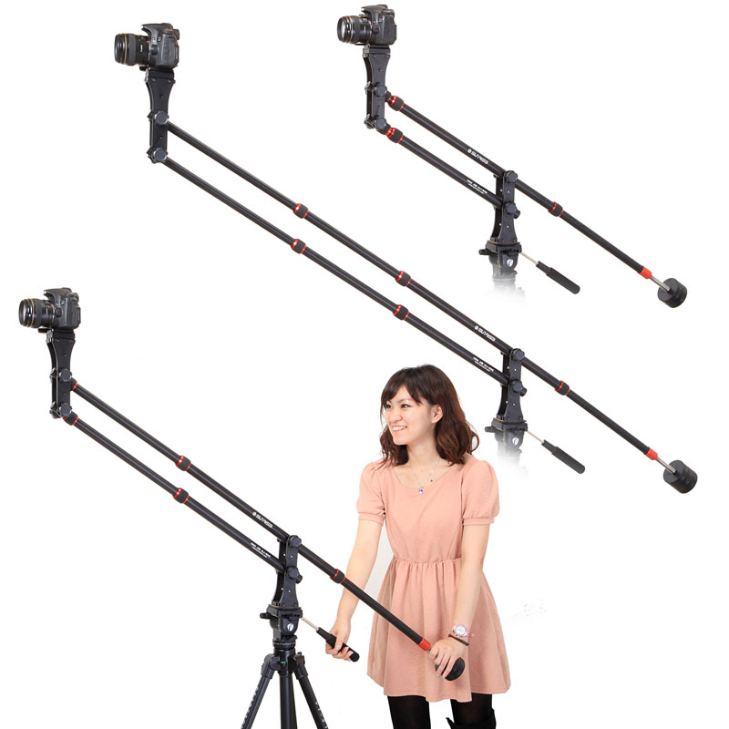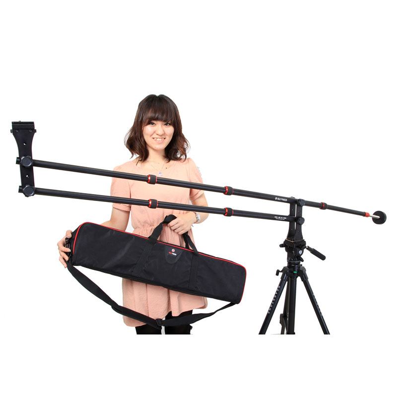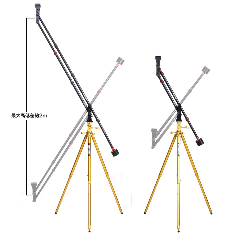 DSLRに最適な伸縮タイプ小型軽量ジブアームです。わずか78cmの専用ケースにウエイトを含むシステム全てを収納でき、誰でも簡単にダイナミックでスムーズなクレーン映像が得られます。高低差は約2m、充分な効果を得つつ、引きが無い狭い場所でも細やかなオペレーションが可能です。1/4”ネジが2穴、3/8”ネジ穴が1穴で通常の三脚やスタンドに装着します。カメラの装着は水準器付きのクイックシューもしくは、付属品のボールヘッドアダプターを介して75mmボールヘッドを装着できます。ウエイトは1枚680g、3枚で約2kgとなり、支柱より後方ウエイト側を伸縮させバランスをとります。
