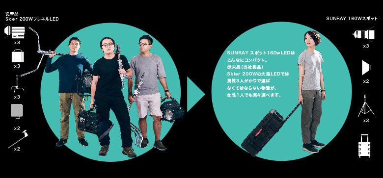 小型軽量で、3台セットでも女性一人で持ち歩けるほどのコンパクトさです。