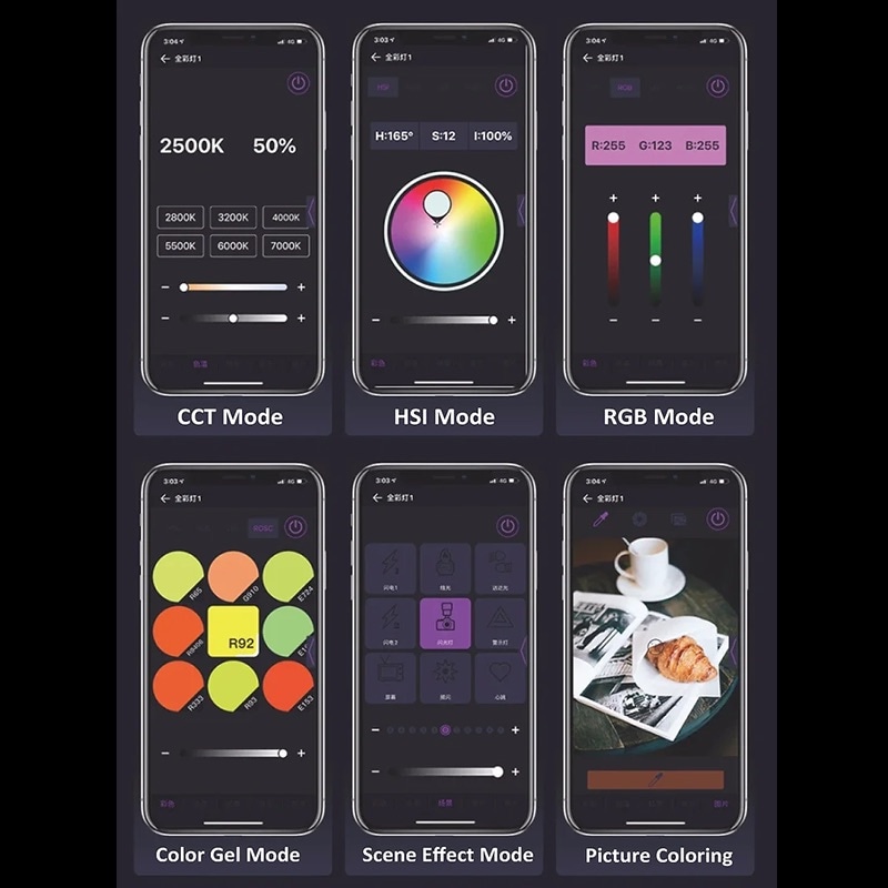 Desal Liteモバイルアプリを使えば、CCTモード(2500-9000K一定出力)+無段階調光、HSIモード、RGBモードなど、さまざまなモードでF7 Miniをリモートコントロールできます。また、アプリに画像をアップロードすると、その色をスポイトして認識し、F7 Miniで同じ色を作れるという新しいピクチャーカラーリング機能があります。